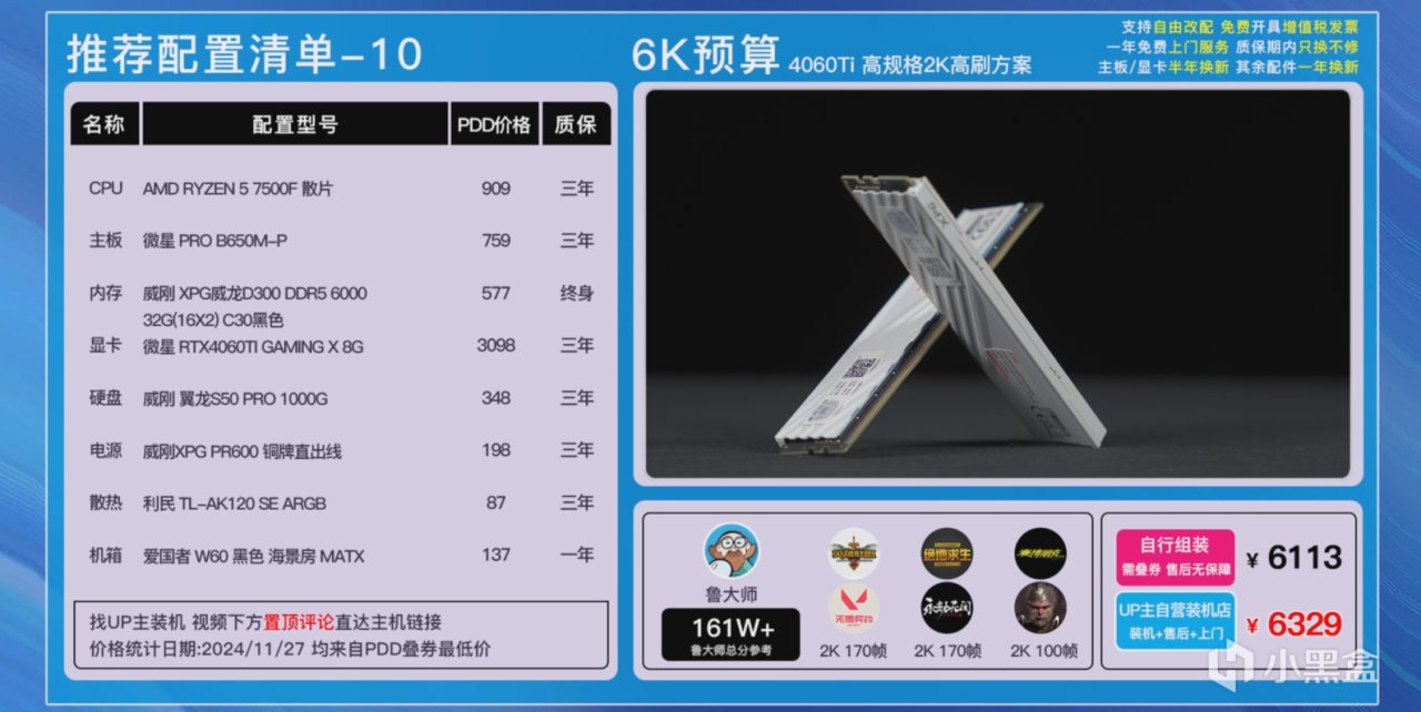 4060Ti的主機因爲顯卡搭配的是魔龍,爲了讓顯卡神光同步,主板我們選擇了微星的B650M-P,內存給到了威剛D300 6000頻率C30時序2根16G組成32G的雙通道,沒有性能損失。