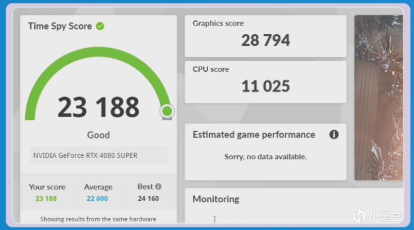 映衆的4070TISUPER 曜夜ULTRA在3D MARK TIME SPY 得分24602分,Pory Royal得分15777分,滿載狀態下它的功耗是來到了293.8W,此時GPU核心溫度只有60.1度,熱點溫度也僅有72.6度。畢竟是使用了4080同款的散熱模具,這溫度表現都跟自家旗艦超級冰龍有一拼了。