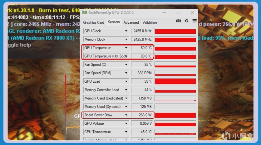 撼訊7800XT櫻花犬在3D MARK TIME SPY 得分20161分,PortRoyal光追得分10784分,在甜甜圈烤機10分鐘後,在功耗爲266W時,GPU核心溫度最終是來到了60度,熱點溫度來到了80度,750W的電源帶動這一套整機還是比較輕鬆的。