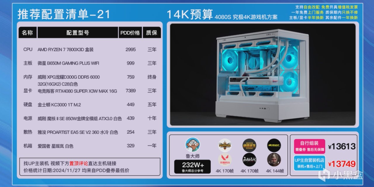 第二套方案則是7800X3D+4080SUPER的純白方案,每個硬件自然也是更換成了白色,而且還有星璨嵐加持,整機的顏值和性能都是無死角拉滿的。即便是後續升級9800X3D,只需要更換一下CPU就行了。