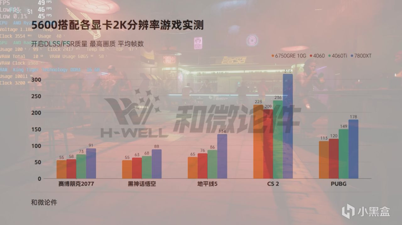 在我們測試的5款遊戲中,測試環境都選擇了2K分辨率畫質全最高,在一些喫顯卡的3A大作中,即便是開啓DLSS與FSR質量檔後,對於6750GRE 10G和4060這兩張不到2000元的顯卡來說還是有點勉強的,但是好在網遊對於這兩張顯卡還是沒什麼壓力的,如果你打算用這兩張顯卡來運行2K分辨率的3A大作,可以考慮降低一點畫質來換取更加絲滑的幀數體驗。但是對於4060Ti和7800XT就不會出現任何瓶頸了。2K分辨率無論是3A還是網遊都可以保證非常好的遊戲體驗。