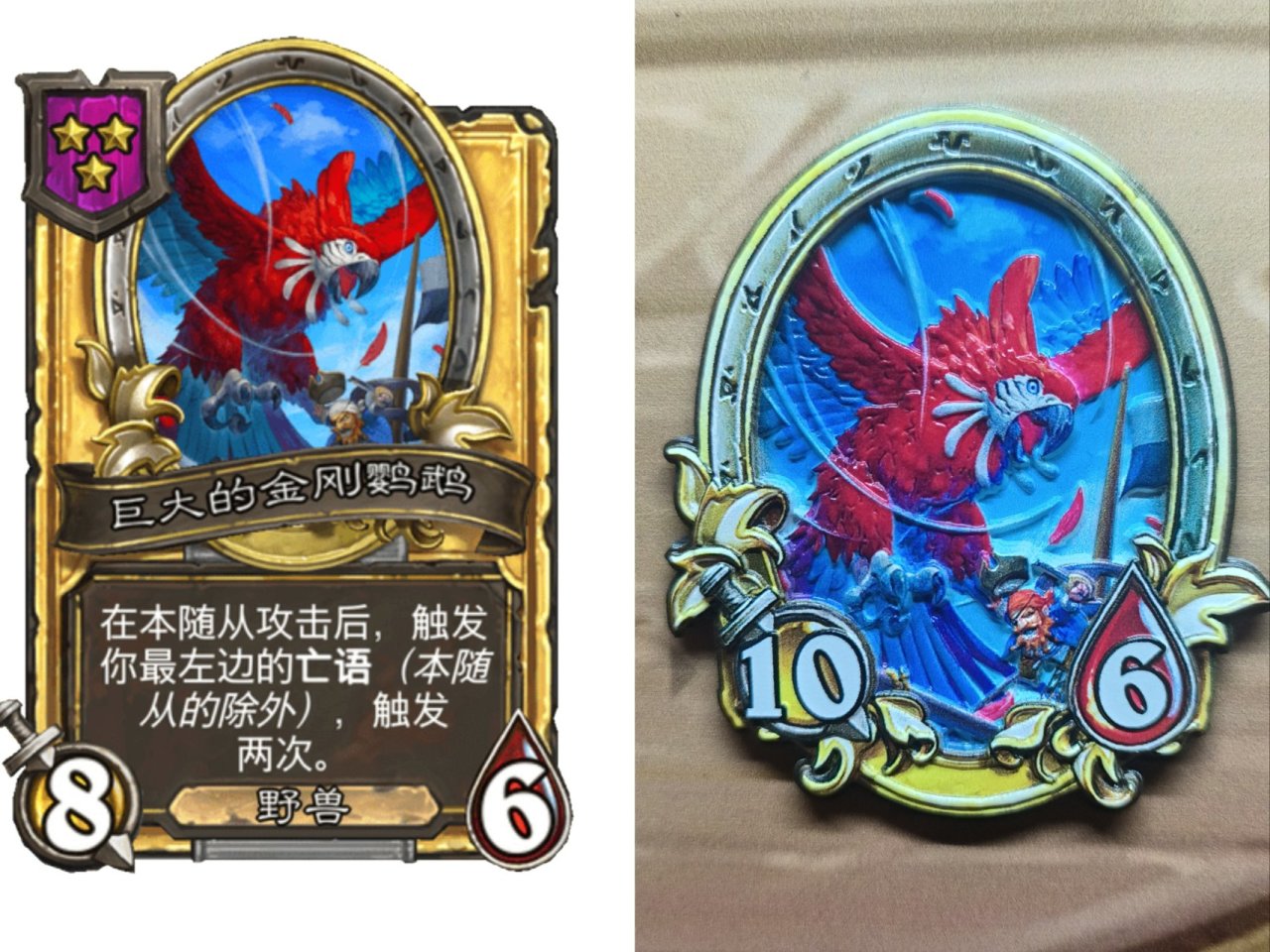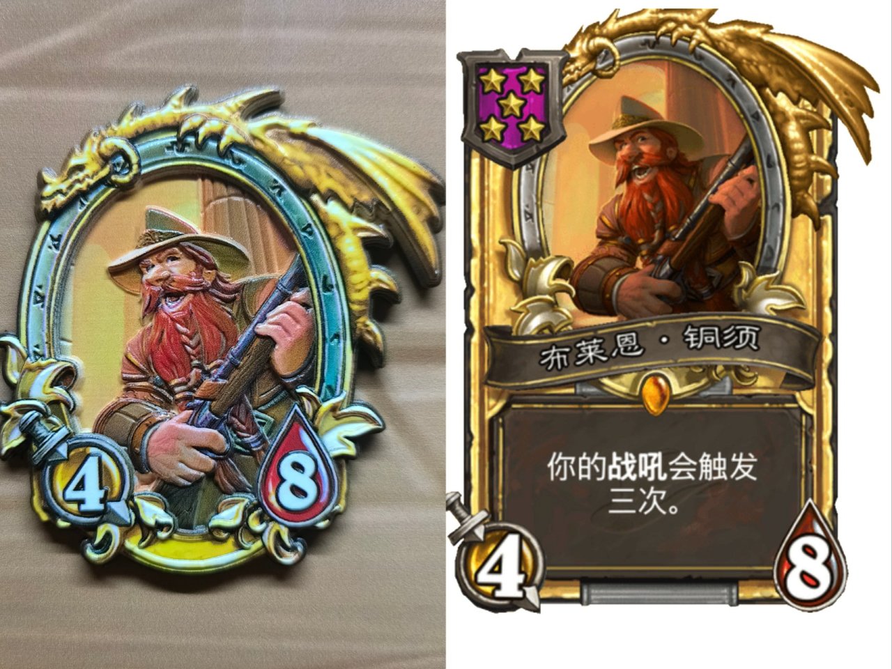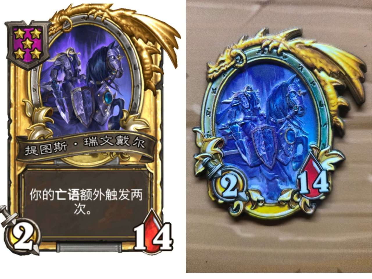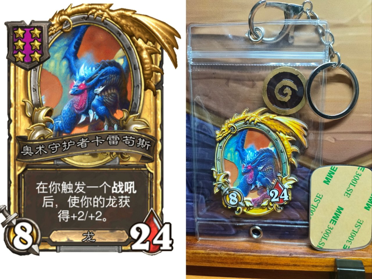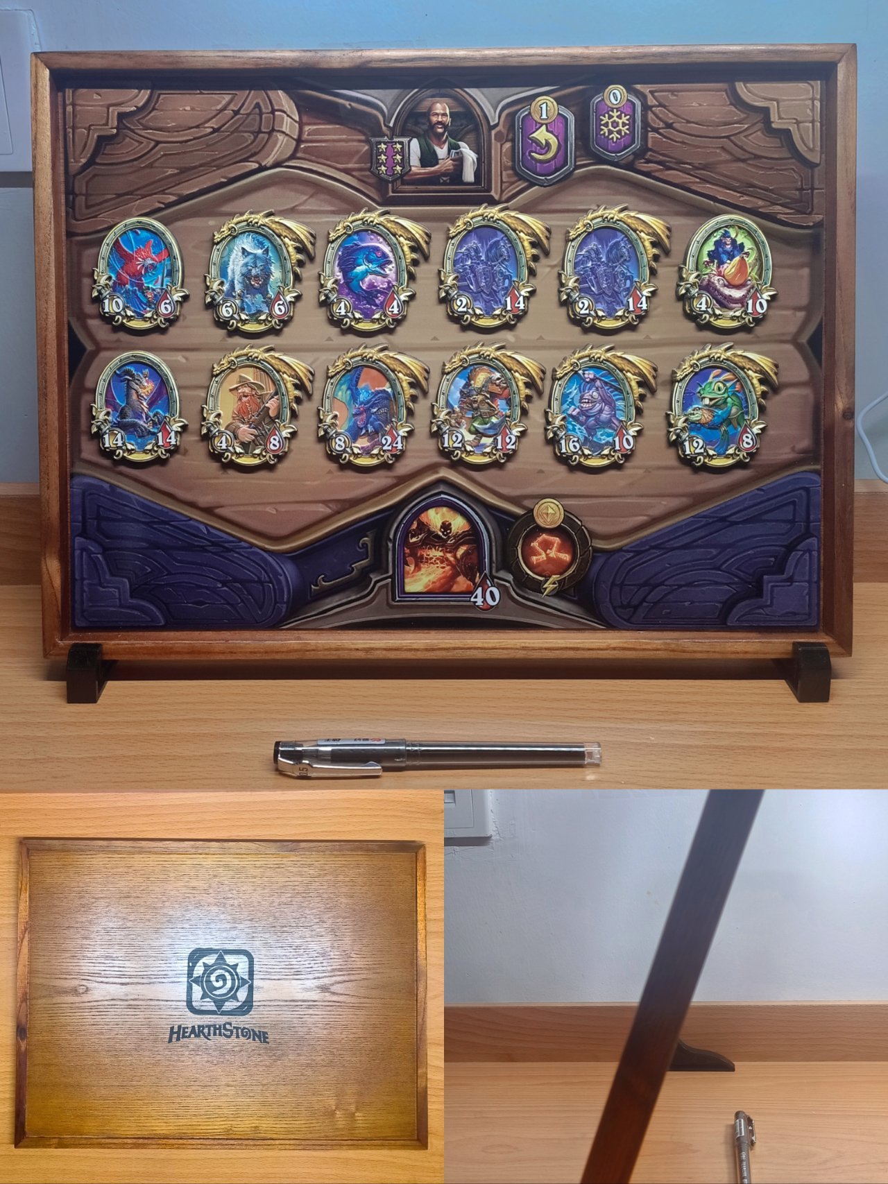 还有一个木质的棋盘,内嵌了一层金属,可以让棋子磁吸在上边,正面以战棋购买阶段作为背景,而背面则是炉石传说的LOGO。