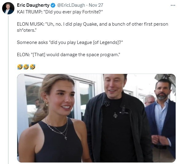 然而馬斯克因爲某個特殊原因,而拒絕玩一些遊戲,比如說《英雄聯盟》。近日在一個視頻中,特朗普的大孫女,17歲的凱·特朗普(Kai Trump)向馬斯克詢問他玩過和沒玩過的一些遊戲。