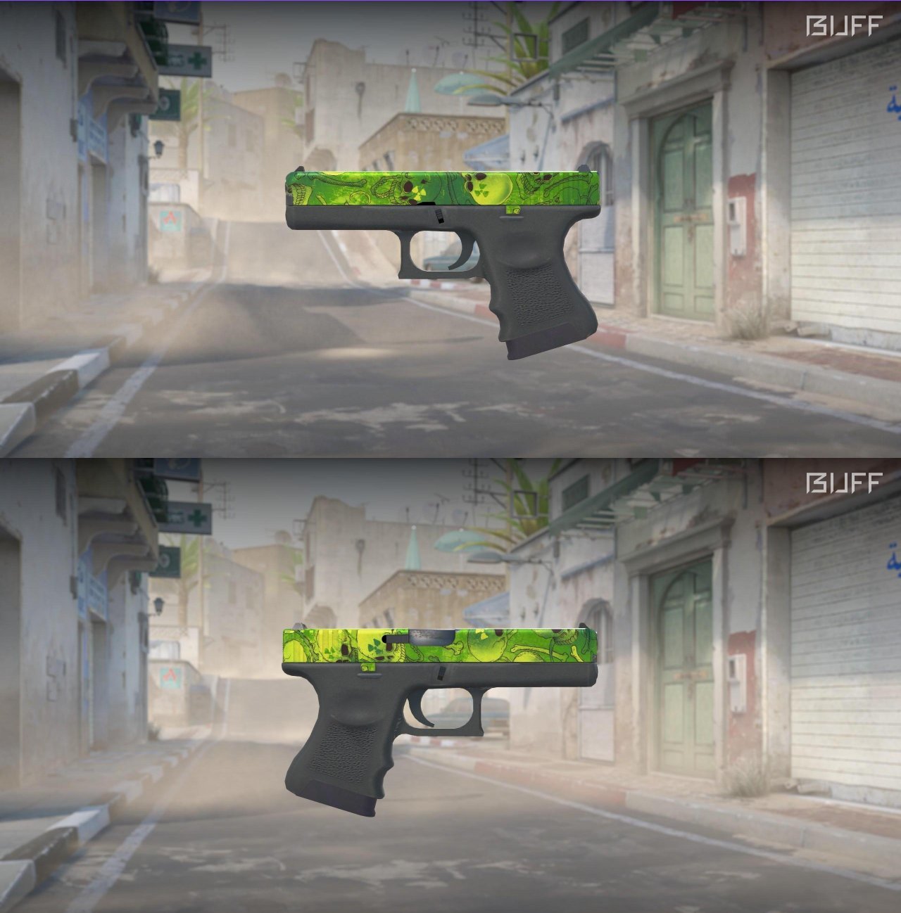 绿底,和枪身上的骷髅头都体现出了这把枪的名字,比较吃磨损,且亮度也和磨损有关,推荐略磨入手