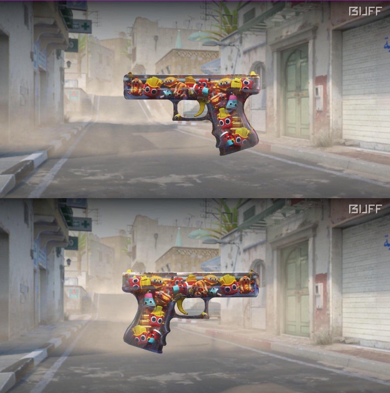一种 3D 风格设计的枪皮,而且上面多种的零食也别具新意,还是很好看的,有些吃磨损,推荐略磨入手