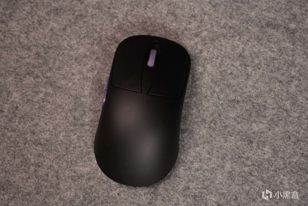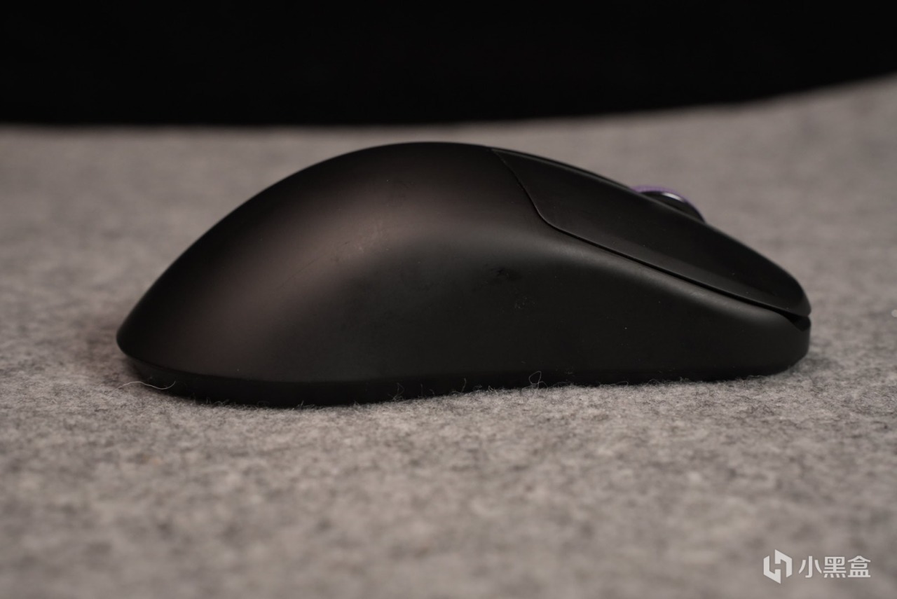 首先看一下鼠標的外形,鼠標採用類膚塗層的設計,能讓鼠標防滑性更好,鼠標整體呈現前低後高的趨勢,這種模具類似於賽睿的SENSI模具類型了,是一個標準的抓握鼠標。但同時小手的趴握其實也行,同時在側邊也設計了側鍵,實測下來並不容易誤觸。