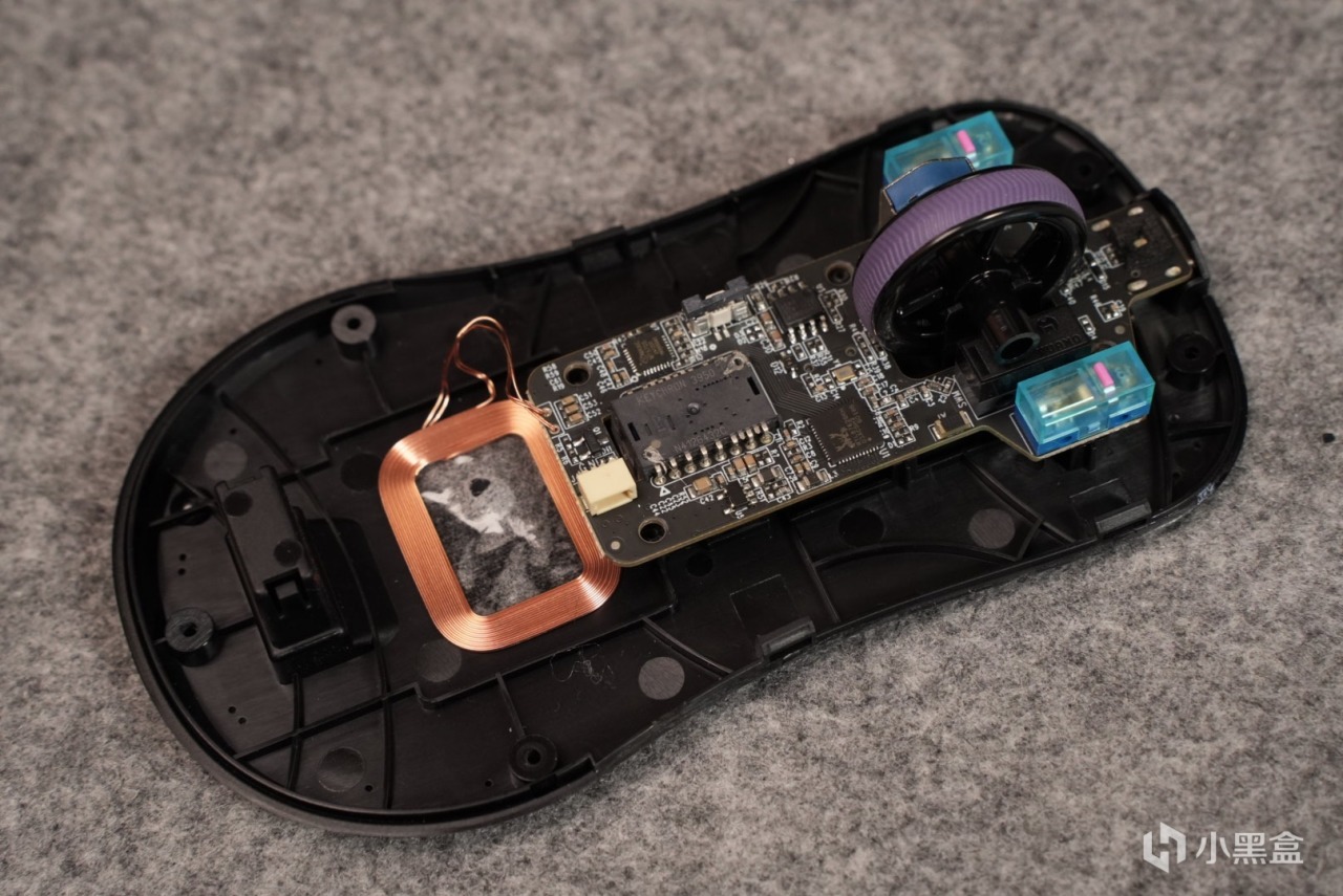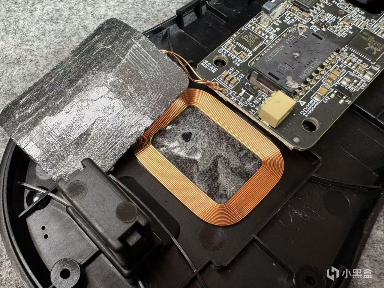 其實這款鼠標讓我最感興趣的一點在這裏,就是這個無線充電模塊,添加了一圈線圈在下面,上面覆蓋着散熱貼,應該是石墨烯的散熱(這裏和各位說一聲抱歉,這方面我的知識儲備量比較少,所以看不出來這個散熱貼的材質,知道的大佬可以在評論區說一下)這裏是我很少見的,現在是面上能不依靠其他配件直接無線充的鼠標我知道的好像這是第一個了。