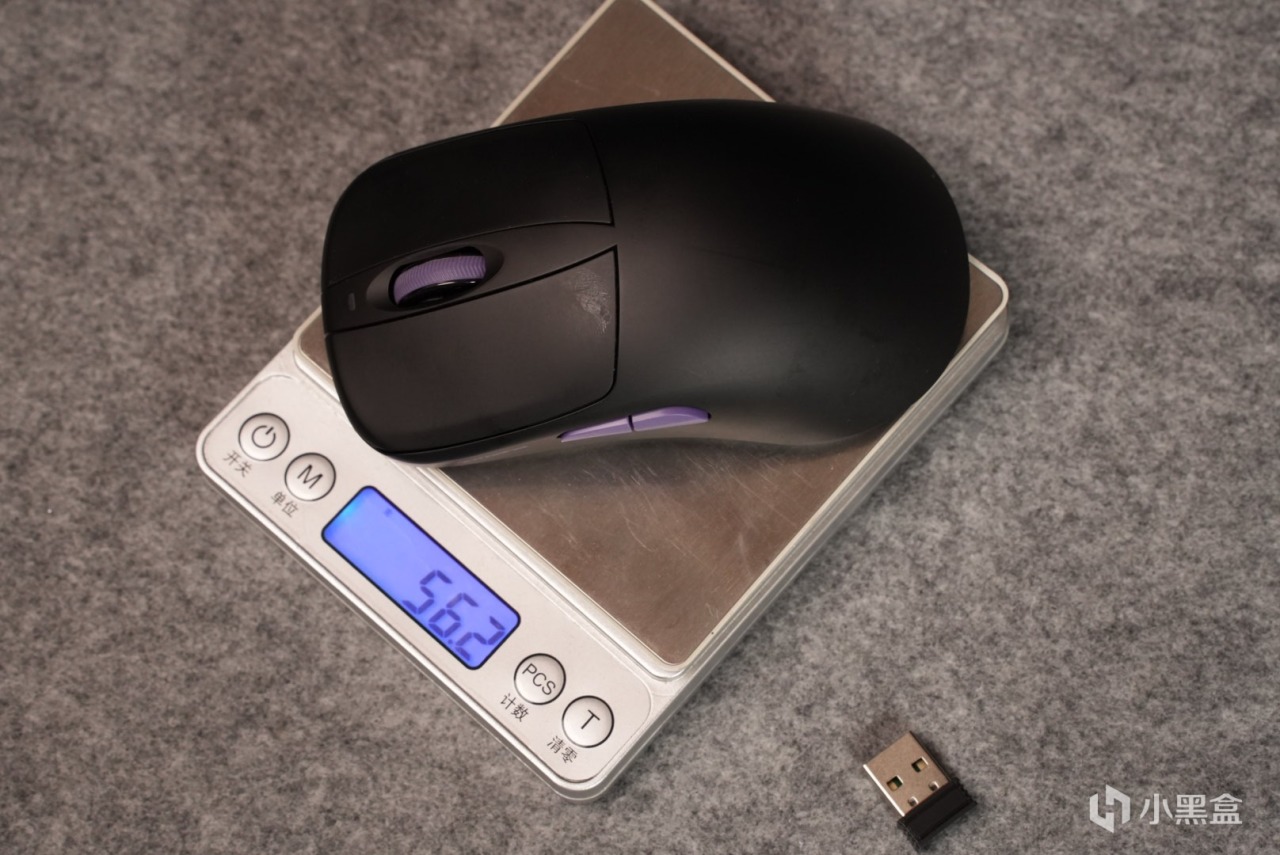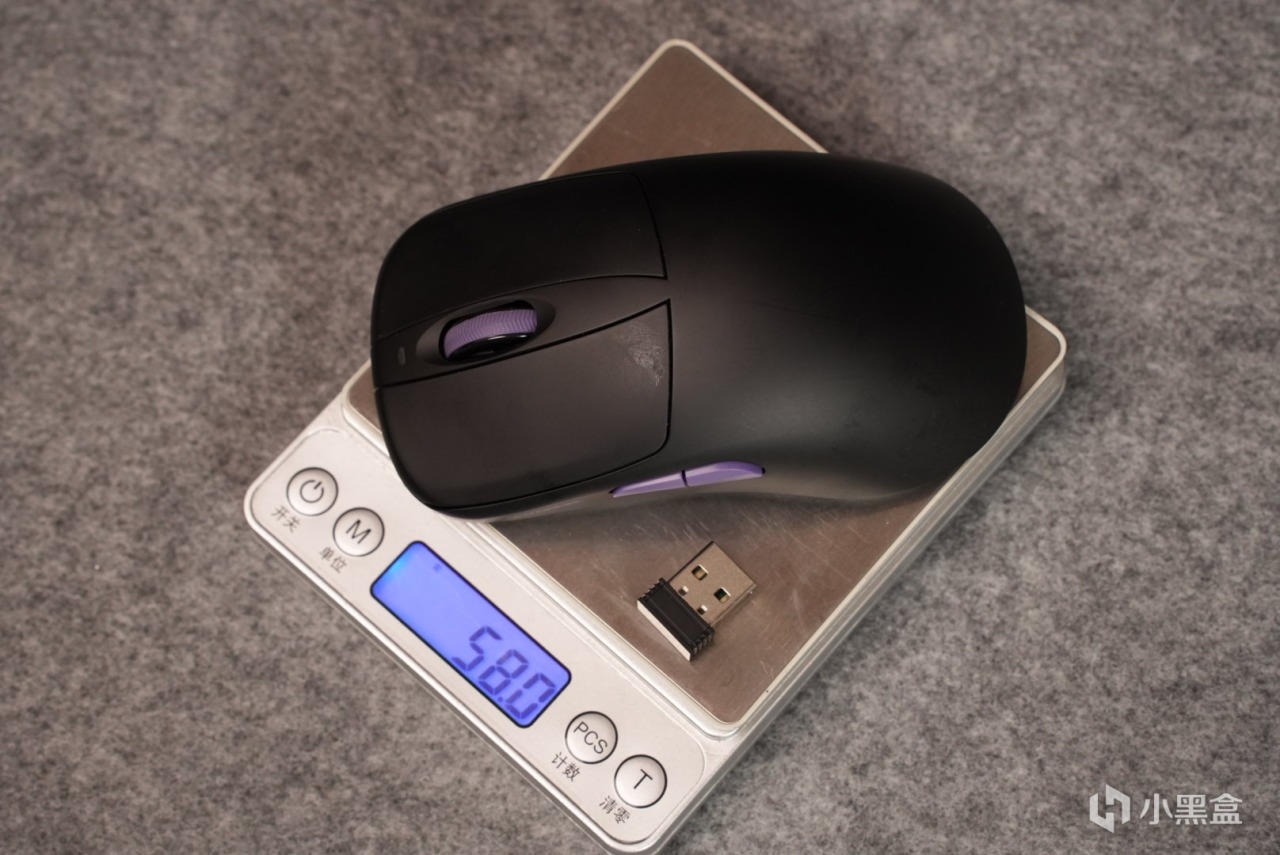 鼠標加上2.4g接收器的重量爲58g整,去掉接收器的重量爲56.2g可以說這款鼠標是一款非常好的大手輕量化抓握鼠標。這個重量的鼠標是非常適合打FPS類遊戲的,各位先別急反駁,我之前也是502用戶,但是自從使用了輕量化鼠標之後,真的回不去了。對了這小接收器是一個8k的,有點離譜,真小啊