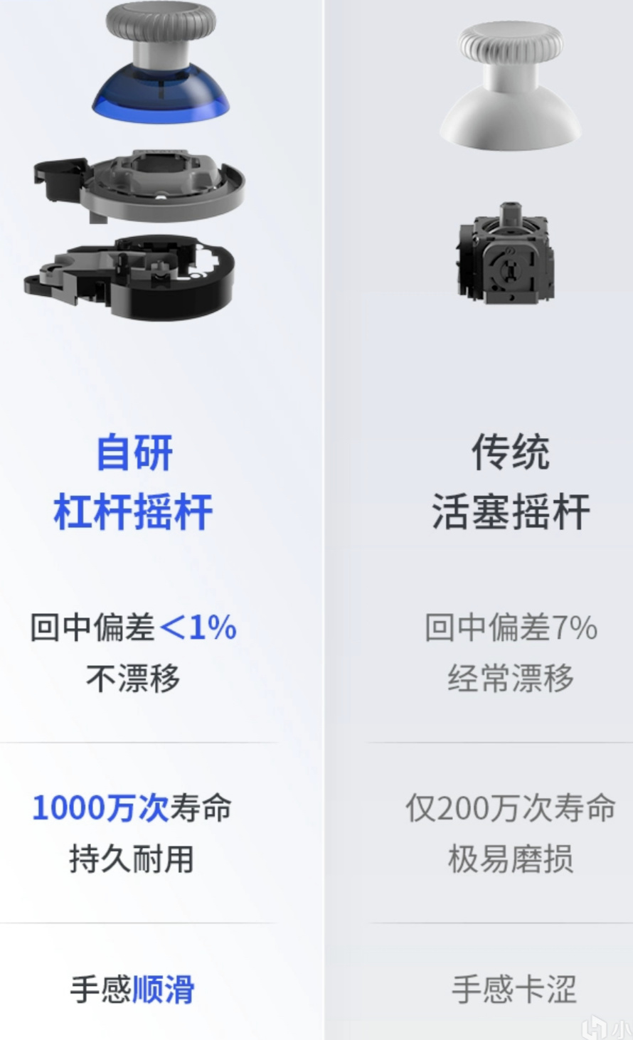 是這次冰原狼3升級的重點了,自研槓桿搖桿,隨着飛智技術升級直接讓百餘元手柄也能用上,雖然不能調阻尼(這也是本次取消POM環設計的原因)。