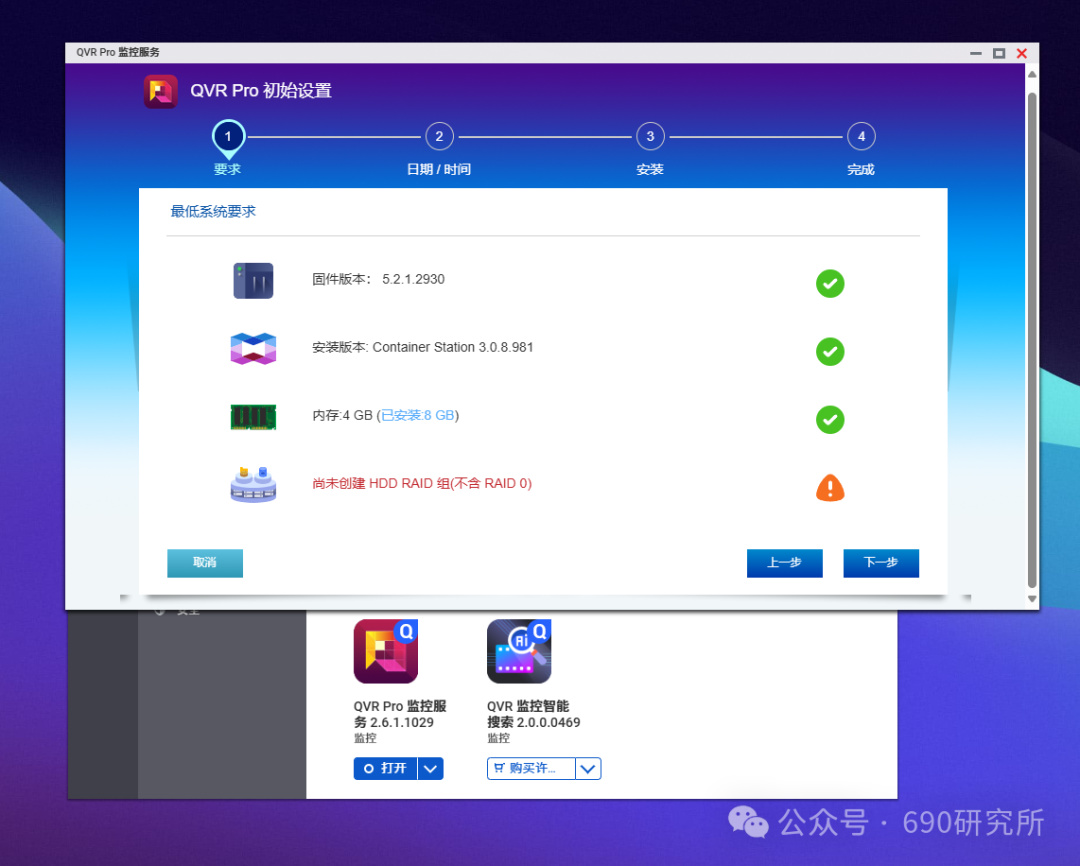 安裝好之後,咱們直接打開QVR Pro,根據提示進行初始化安裝設置。這裏需要注意QVR Pro對於內存有一定的要求,必須是4G以上,不然無法安裝。