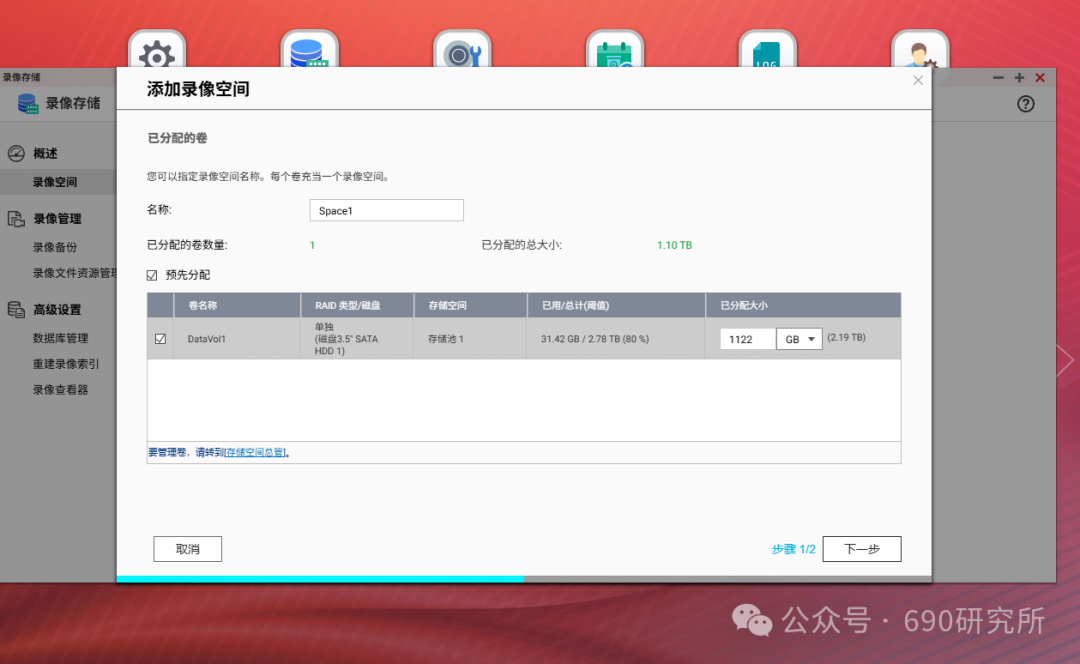 進入錄像存儲,咱們在自己的存儲池中爲監控新建一部分存儲空間,具體設置多少這就看你自己了。