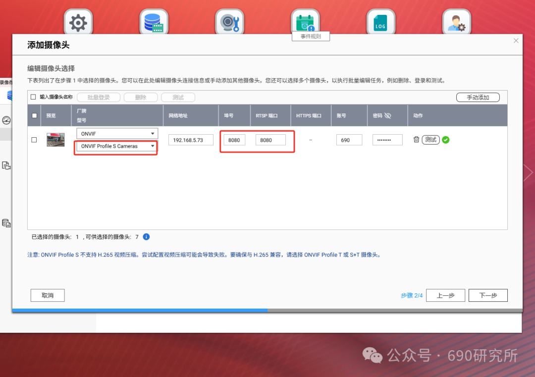 在下一步中設置好,咱們前面在APP內設置的端口號,賬號以及密碼這些。在前面的型號處選擇ONVIF Profile S Cameras,最後點一下測試,顯示綠色的勾號即表示沒有問題。