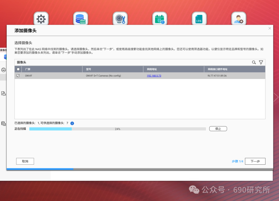 做好這些之後,手機上顯示的就是攝像頭拍攝的畫面了。我們回到QVR Pro後臺,打開攝像頭設置,選擇添加,QVR Pro會自動搜索當前網絡中支持的攝像頭。