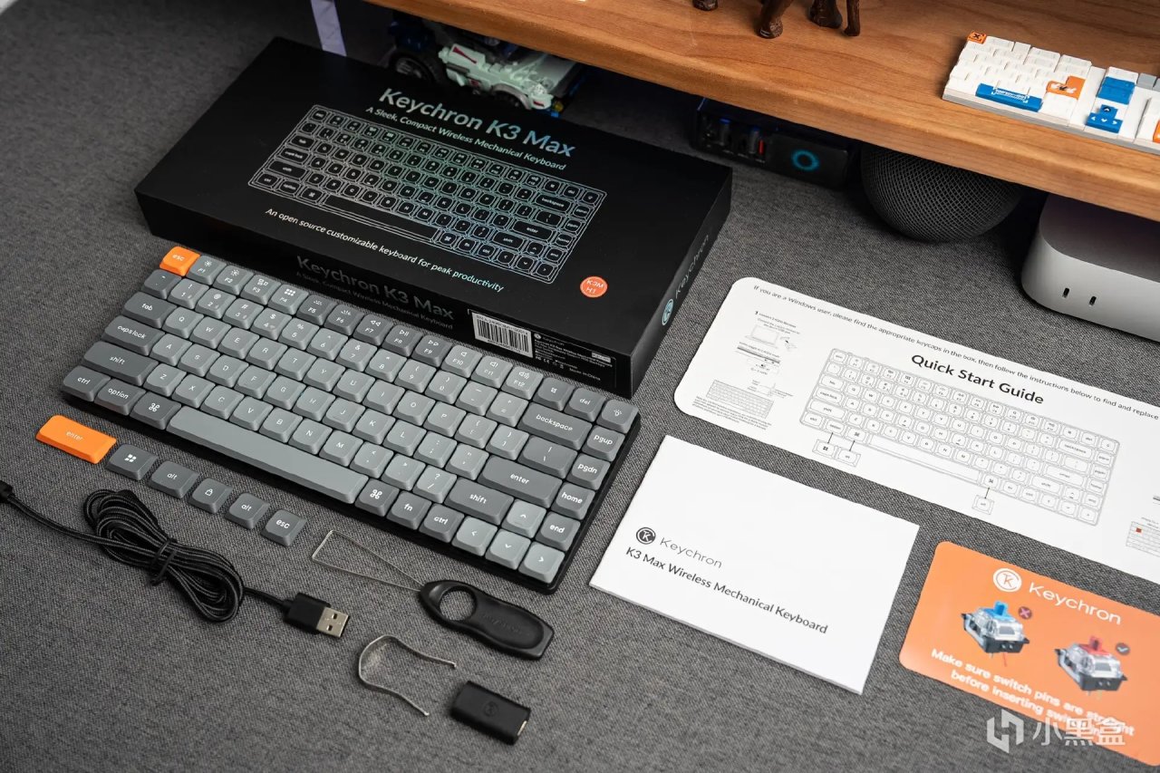 打開包裝,除了鍵盤本體,鍵盤主要附件有拔鍵器、USB連接線、USB轉接頭以及一套Windows增補鍵帽。Keychron K3 Max支持Mac和Windows雙平臺,默認出廠搭配的是Mac功能鍵。