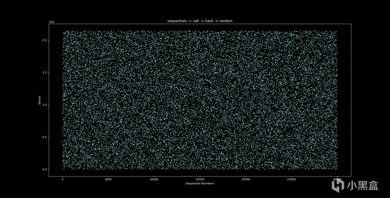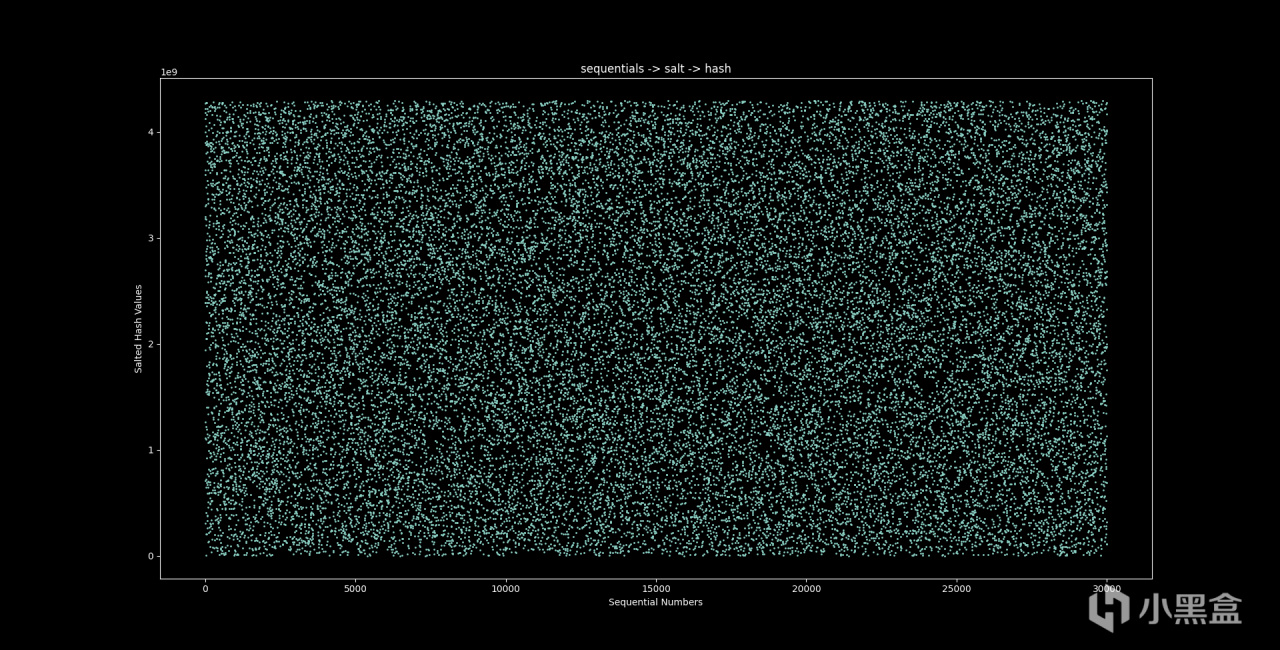 当我们将加盐的哈希值输入随机数生成器时,我们再次得到一个漂亮的点云,没有任何明显可辨别的模式。
