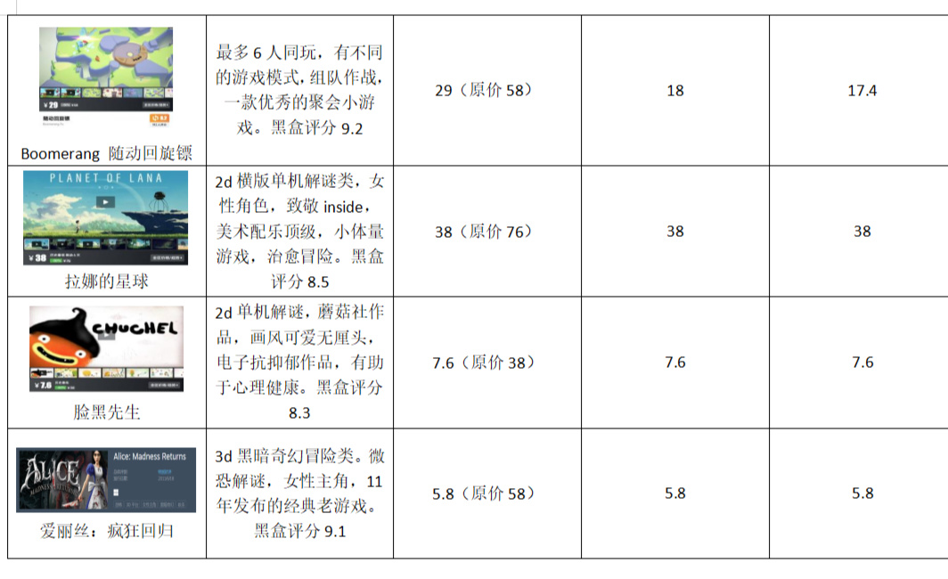 回旋镖是聚会小游戏,steam上不是史低,可以等史低入手,和家里人or朋友一起玩哈哈哈哈,应该会很快乐。剩下的这三个都入手了,尤其是脸黑先生,上班怨气重的时候可以拿出来玩玩。爱丽丝还没玩,但是画风超爱,等我玩完再反馈叭。