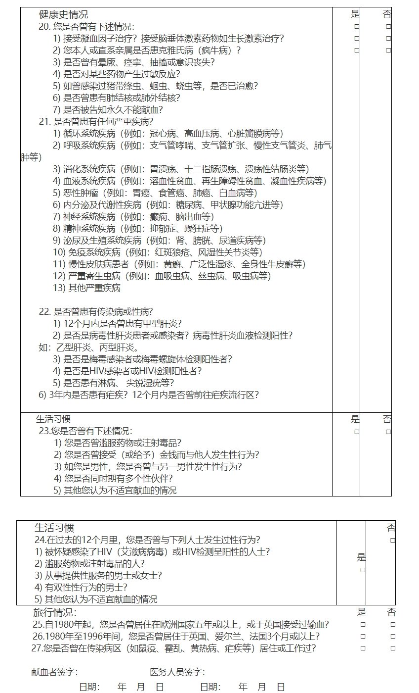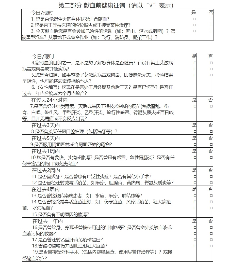 同時圖附獻血應知內容和健康徵詢表供hy自查