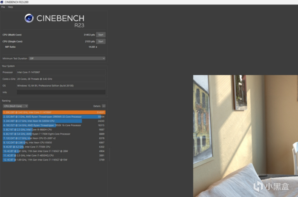 来到 CINEBENCH R23 这个测试场地,i7 - 14700KF 继续它的表演。单核成绩达到 2155pts,多核成绩高达 31453pts,这成绩就像游戏里打破了最高纪录一样,多核能力强得不像话,在众多处理器中脱颖而出,就像游戏中的冠军选手,站在领奖台上接受众人的敬仰。