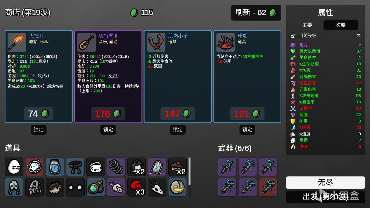 开局携带冲锋枪,在第一回和卖掉初始的手枪,开始刷新商店,平均每回合刷新4-5次买冲锋枪,前1-10回合刷新1-3次,后面有加特林替换冲锋枪
