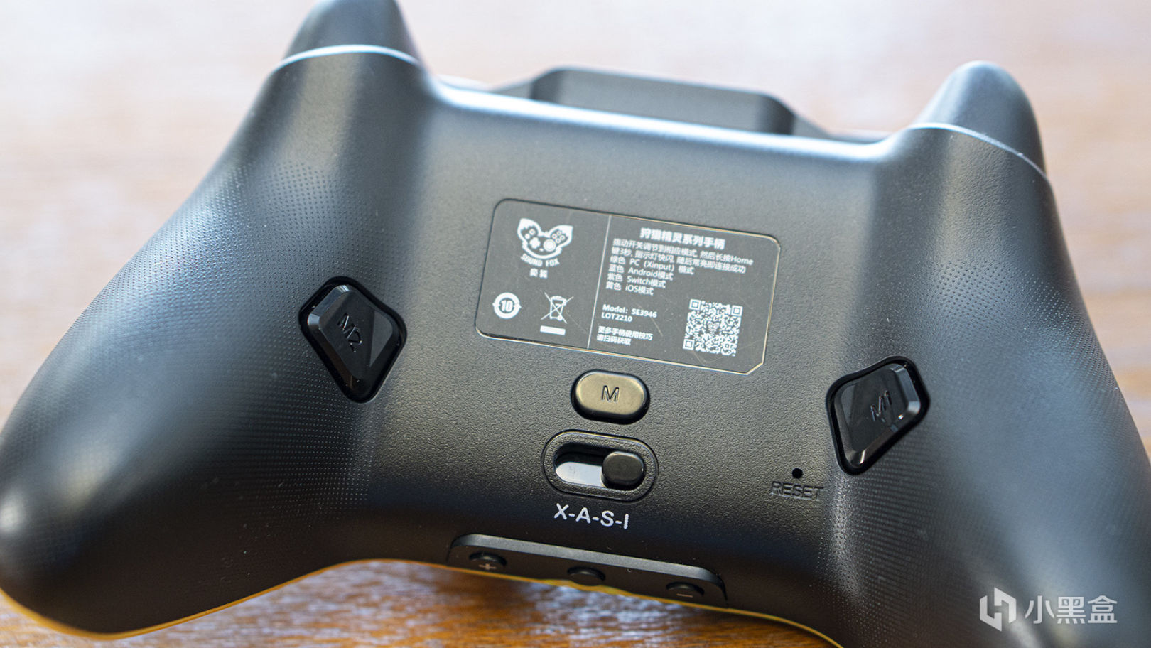 手柄的背面有M1、M2兩個宏鍵、調節連發震動的M鍵及採用了撥杆模式的手柄模式切換鍵。握把處採用了防滑處理,手感不錯!