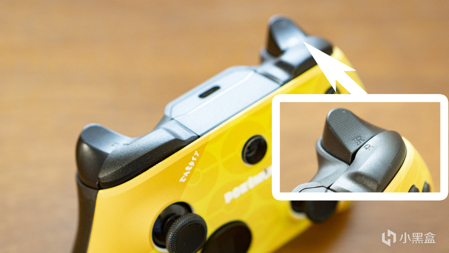 從頂部來看,它的設計中規中矩,中間爲TYPE-C數據口,左右分佈着LR及扳機鍵。其中扳機鍵上的標識爲“T/Z L”及“T/Z R”,方便不同平臺的小夥伴們快速適應新手柄。