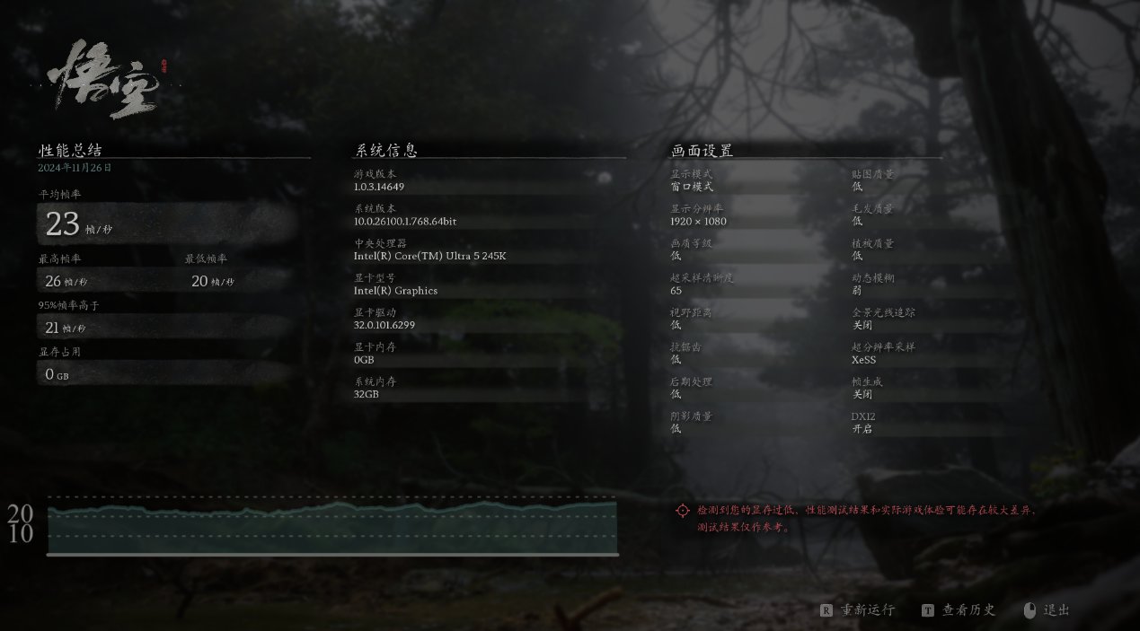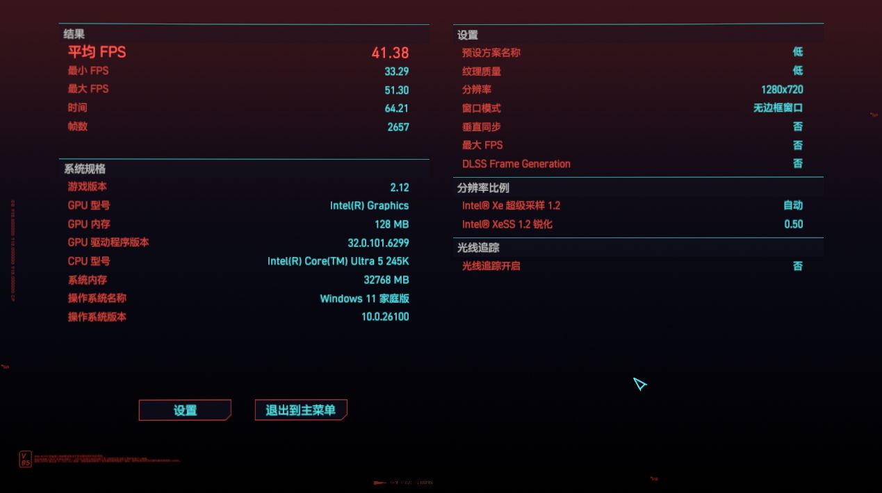這代核顯的性能提升真的驚到我了,3Dmark 跑分和 1050、MX450 都能掰掰手腕了。我用核顯試了幾個遊戲,原神在 1080P 高畫質下跑得挺流暢;黑神話・悟空在 1080P 低畫質也能玩;賽博朋克 2077 在 720P 低畫質下平均 FPS 能達到 41.38 呢,雖然不是特別高,但也能讓你在夜之城逛逛了。要是再換上高頻 D5 內存,那核顯性能估計還能再上一層樓,就像給小火箭加了燃料一樣。