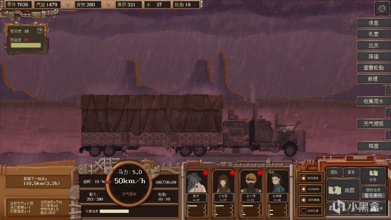 玩家驾驶着一家车辆在无垠的戈壁滩上进行游戏,玩家有很大的自由性,你可以选择去各个定居点,在旅途之中,会遇到各种各样的突发事件,还有各种各样的天气,玩家根据具体发生的事件,自己的游戏想法,进行选择,会触发不同的事件结果,游戏至始至终只是给出了一个起点与终点,无论你以何种方式到达都可以。这之中就可以体会到各种选择的结果,是武装自己的战车,是直接走向终点,还是探索整个地图,还是接受在城市接受到的任务,还是进入危险的地方搜刮物资,这些都是玩家自己的选择。