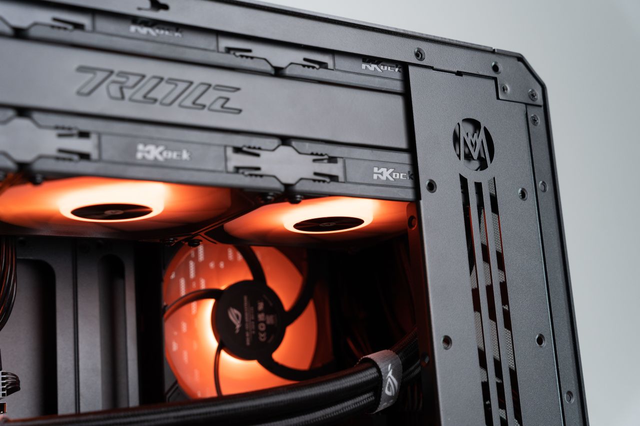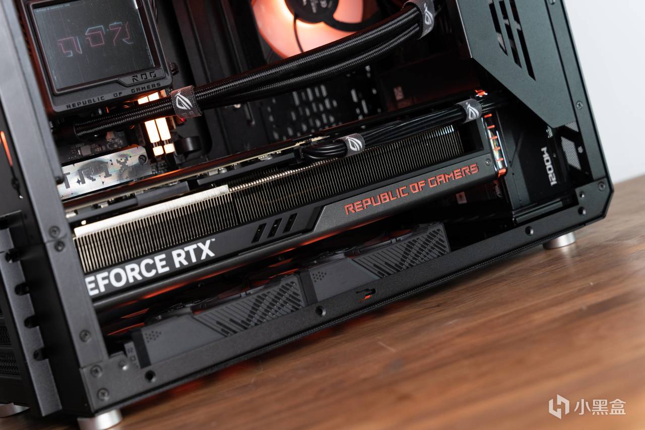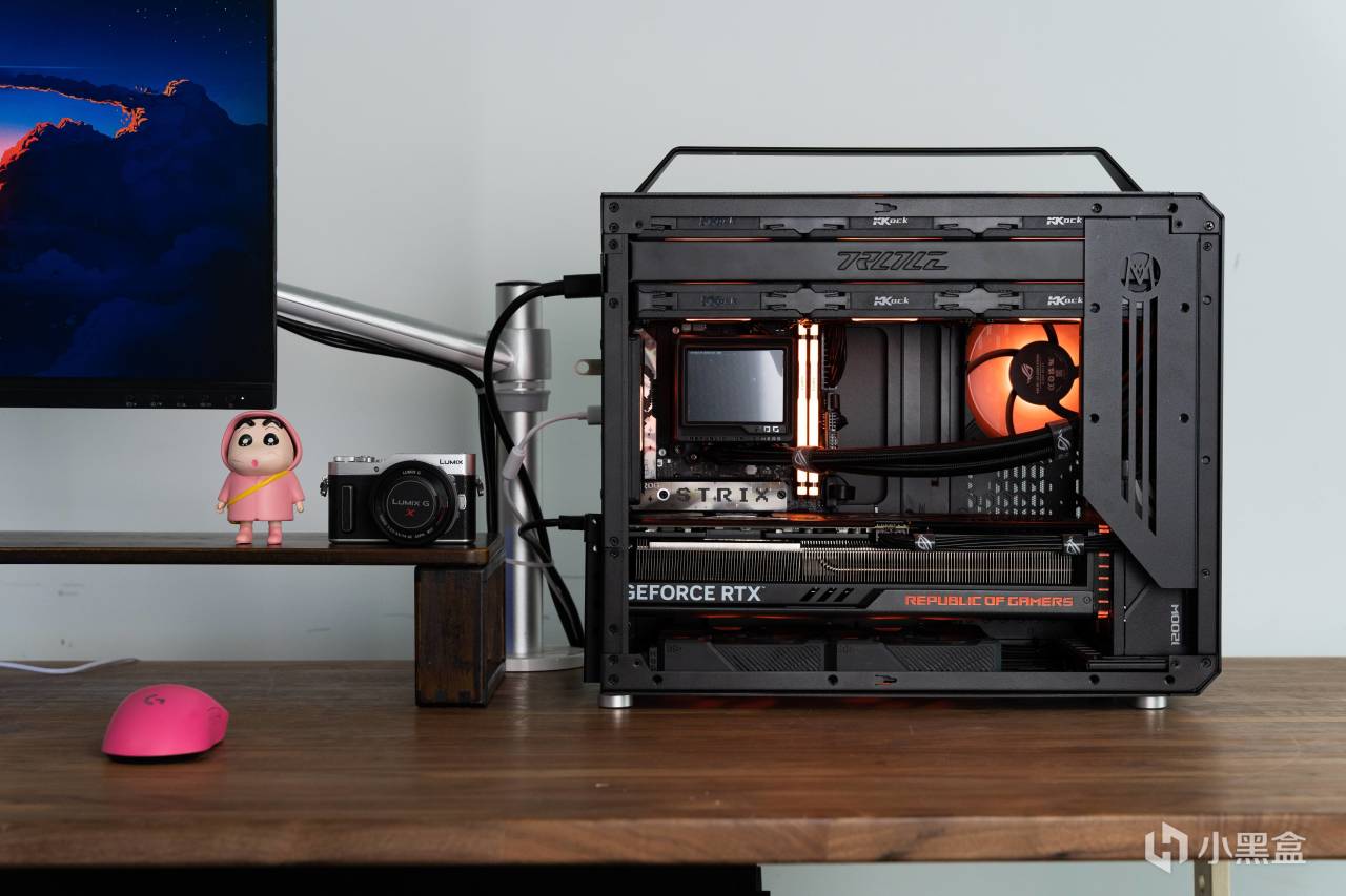 今天這套可以說是細節拉滿,首選是ATX機箱上ITX主板,目的是爲了兼容雙層冷排的超強散熱設計,十片風扇加上華碩的龍神三代水冷,散熱焦慮症瞬間痊癒
