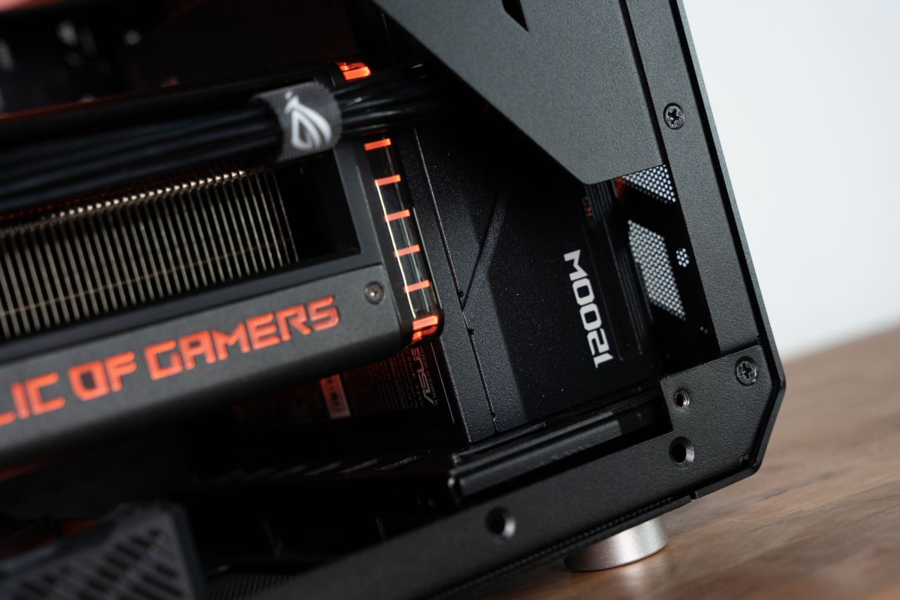 這套主機的另一個細節則是4090猛禽和洛基電源的完美融合,電源採用了下置的安裝方案,C34PRO這款機箱的尺寸剛好兼容兩者,互不衝突;