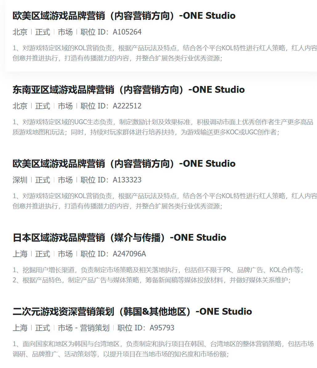 从官网的招聘信息来看,发行部门ONE Studio正在针对欧美、日本、东南亚等国家地区,招聘专项人才。而在研发人员的招聘信息中,「全球」「海外」也是高频出现的关键词。