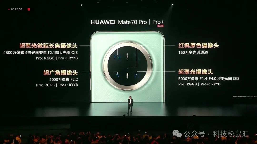 华为Mate 70系列在影像方面也迎来重大升级,全系首发红枫原色影像系统,色彩还原度提升120%,不论是拍照还是拍视频,色彩都更加真实。华为mate70采用5000万主摄+4000万超广角镜头+1200万长焦镜头+150万多光谱红枫原色摄像头。Mate 70 Pro和Pro+搭载5000万像素主摄+4800万像素微距长焦镜头+4000万像素超广角镜头+150万多光谱红枫原色摄像头,支持10档可变光圈,Pro版本采用RGGB传感器,Pro+版本采用RYYB传感器,进光量提升40%,暗光场景下表现更出色。