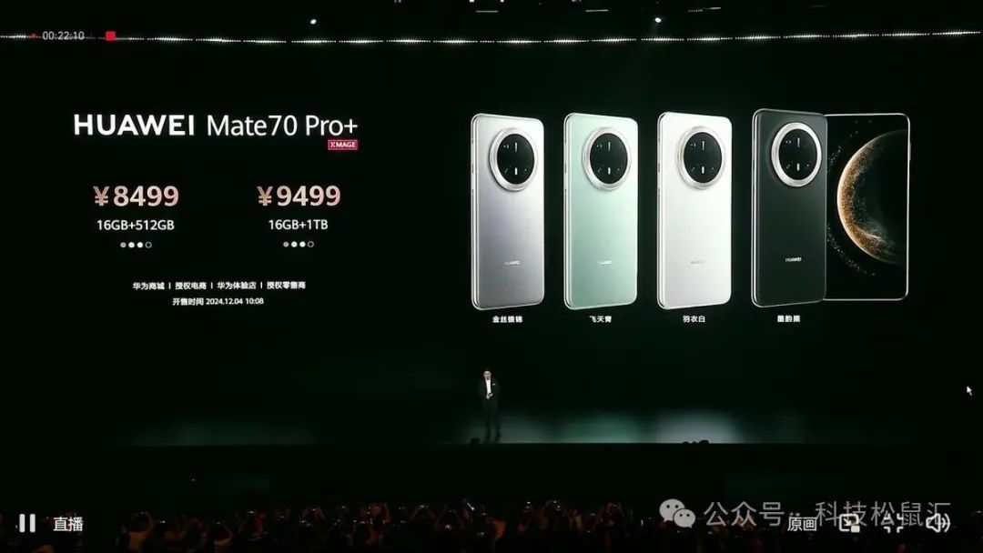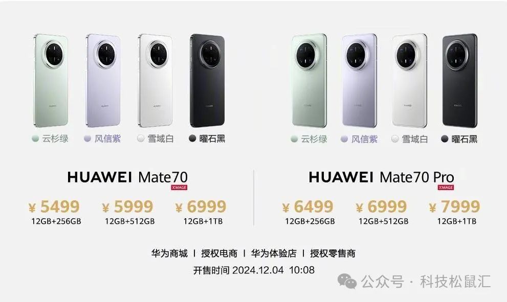 售价方面,华为mate70全系没有涨价,售价与mate60系列一致。华为mate70售价5499起,华为mate70Pro售价6499起,华为mate70Pro+售价8499起,华为mate70RS非凡大师售价12999起,12月4日10:08开售,具体售价如下。