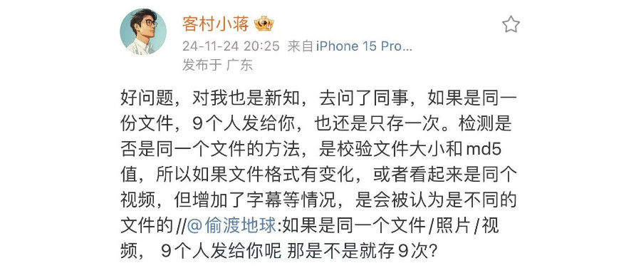 对此,腾讯员工@客村小蒋 表示,微信已经用了硬链接的技术,不管发给2个好友、20个好友还是200个好友,都只保存一份,并进行了现场实测。