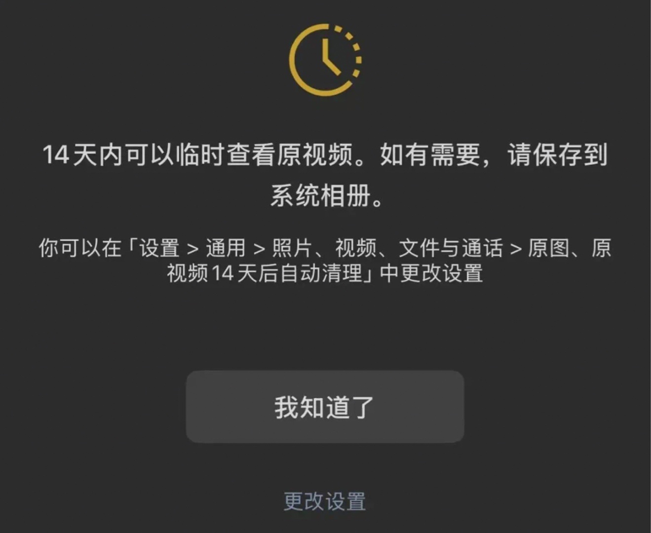 目前,“原图、原视频14天后自动清理”功能处于小范围灰度内测的阶段,求求赶紧放开吧,小内存手机可太需要了!