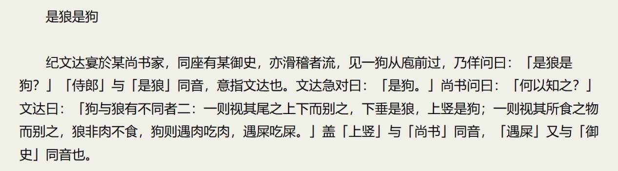 紀曉嵐立即回擊說:"狼性固然喫肉,狗也不是不喫,它是遇肉喫肉,遇屎喫屎(御史喫屎)"。