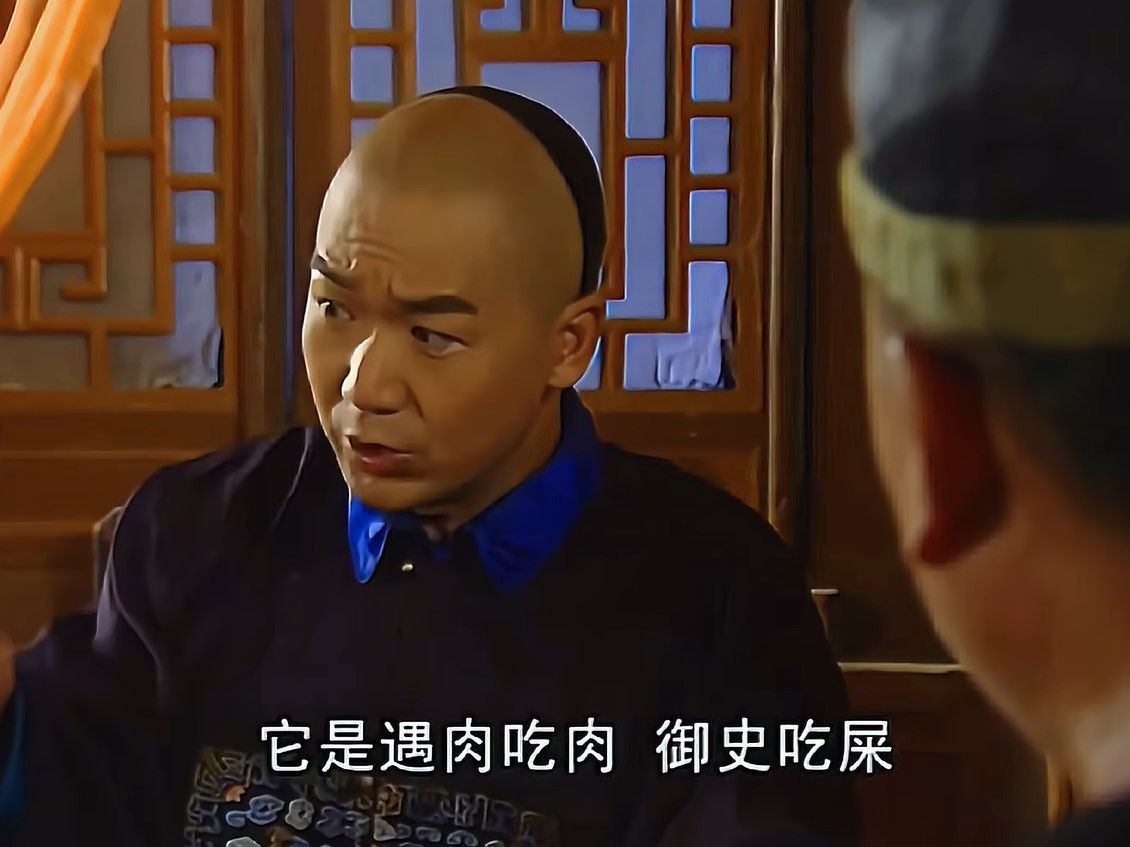第一輪交鋒完,接着坐在和珅旁邊的劉御史說:"狼喫肉,狗喫糞,它喫肉,是狼是狗(侍郎是狗),毫無疑問"。