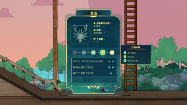 NPC心情分爲5個檔次,喫到好喫的食物會增加(喫到最愛的食物會大幅增加),反之捱餓會降低;