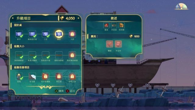 隨着船員的增加,所需要的的功能性建築和居所也逐漸增加,需要在船工處進行空間的升級,可以進行設計桌的升級(解鎖更多建築物)、船頭升級(增加破冰等功能和航速)、船體升級(擴容建築空間)