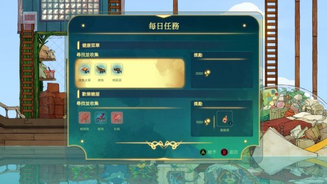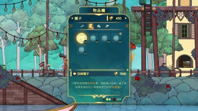 除此以外他還會提供任務給玩家,包括了一次性的收集任務和每日任務(遊戲時間的每天),每日任務是固定的,比如蘋果&櫻桃&梨的水果套餐和亞麻&羊毛纖維的紡織物套餐,這些也是玩家獲取燈火、種子和寶石的重要途徑