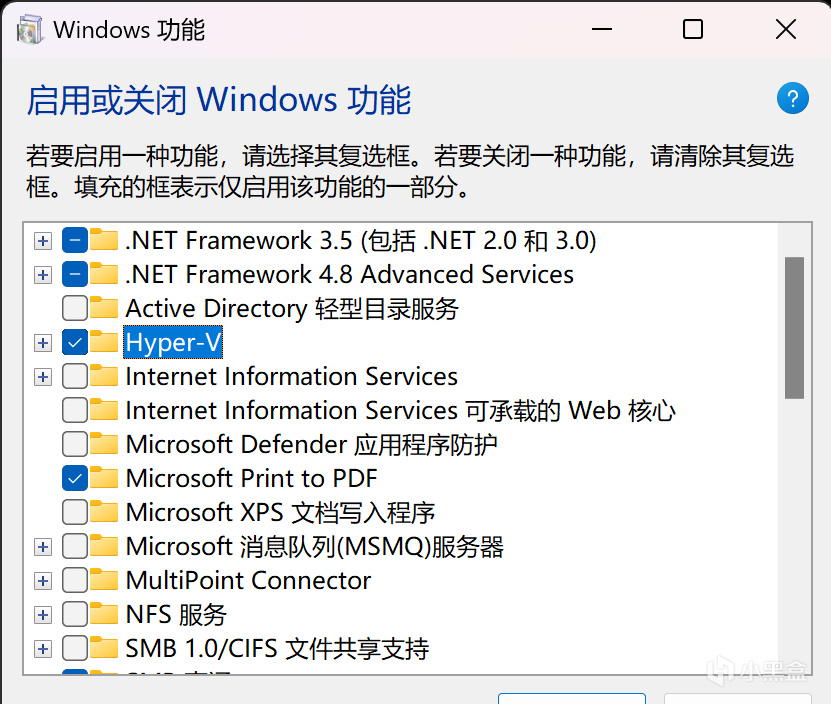 需要注意的是,Hyper-V僅用於重新壓縮虛擬硬盤文件的大小,可以不啓用,但之後若在WSL中下載了大量文件再刪除後,刪除後空出的那部分空間依舊會佔用虛擬硬盤文件的大小。