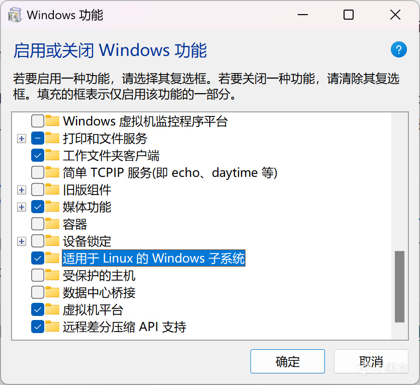 首先搜索並打開“啓用或關閉Windows功能”,勾選上“適用於Linux的Windows子系統”和"Hyper-V"