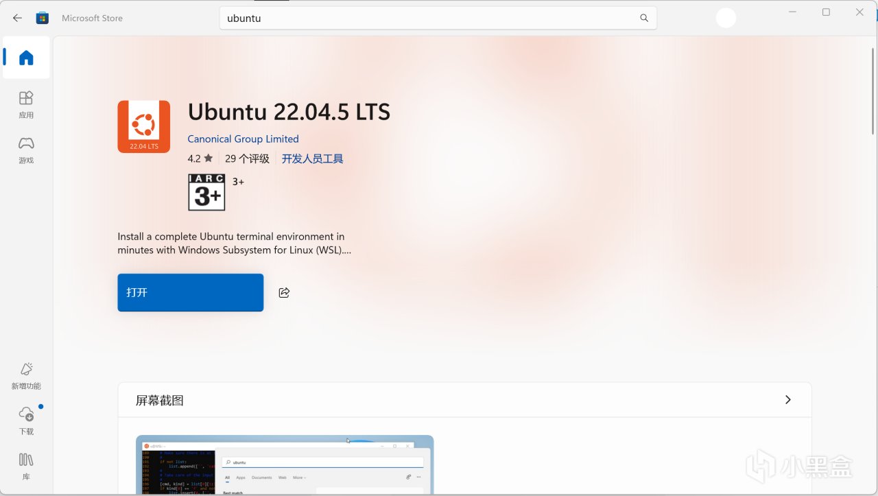 勾選完成後點擊確定並重啓電腦,之後進入微軟商店安裝Ubuntu 22.04,注意,一定要有22.04的版本號,不能是其他版本,也不能僅有一個"Ubuntu"但是沒有版本號,目前只有22.04是受AMD支持的WSL版本,其他版本無法正常安裝GPU驅動和ROCm。
