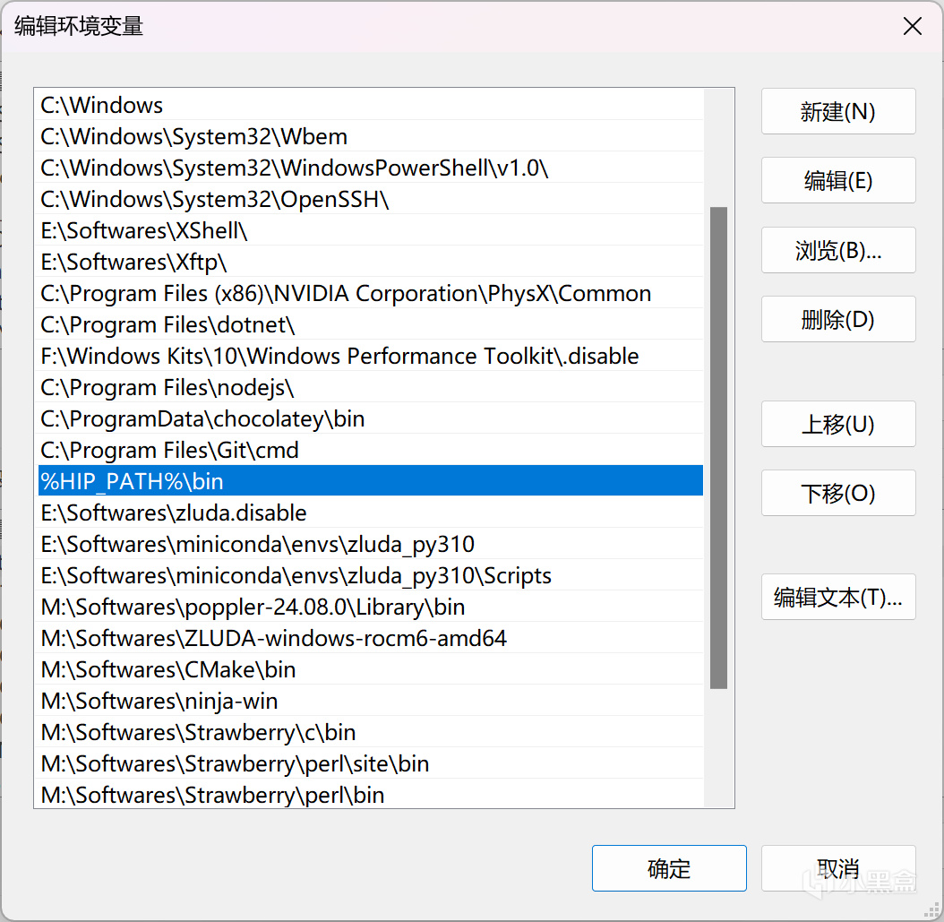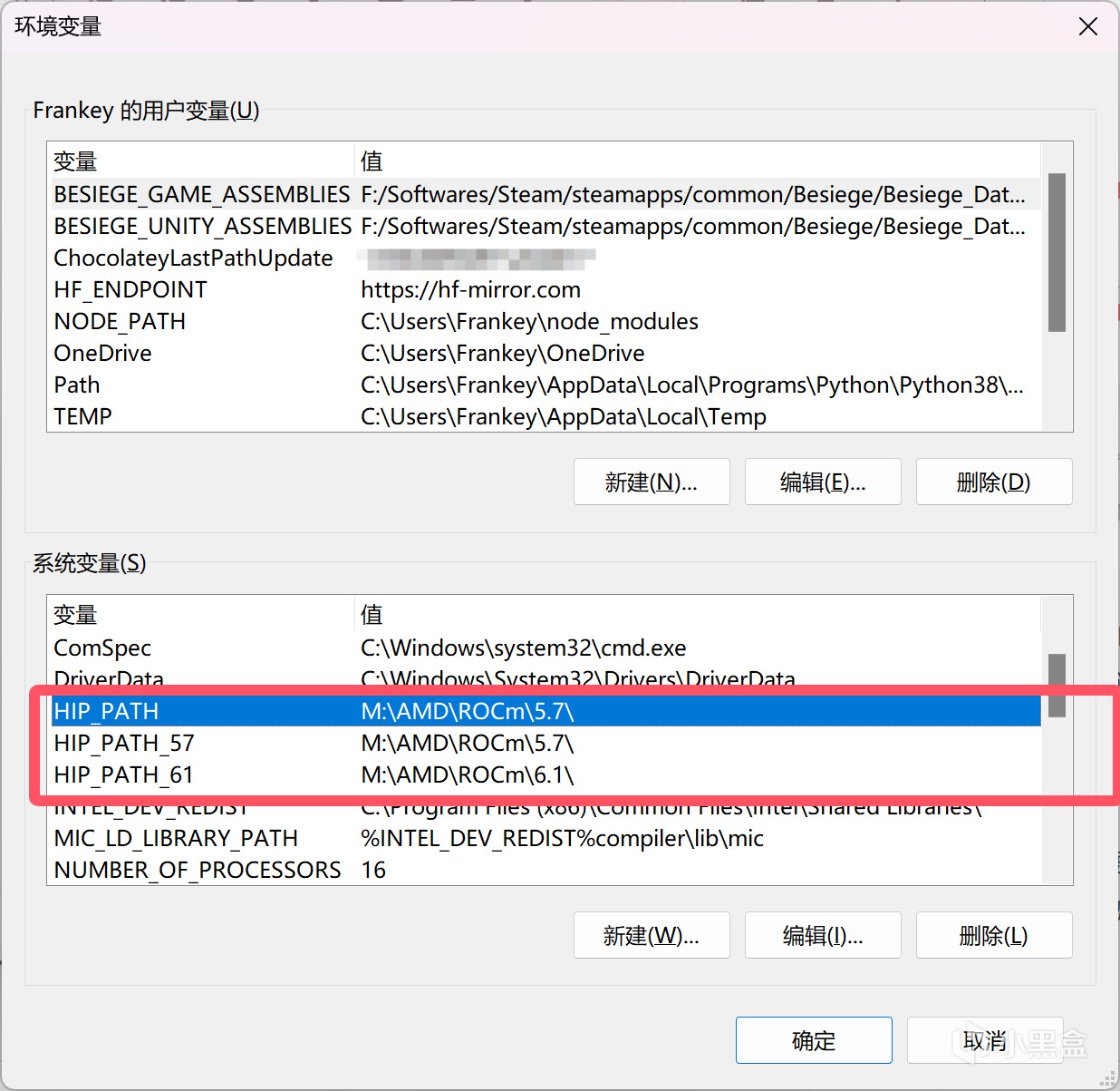 如果你同時安裝了6.1.2版本和5.7.1版本的HIP SDK,那麼需要編輯HIP_PATH_57、HIP_PATH_61、HIP_PATH共3個變量,分別設置爲你各個版本的HIP SDK的安裝位置,就和我圖中的一樣。如果只安裝了一個版本,那就少設置一個即可。