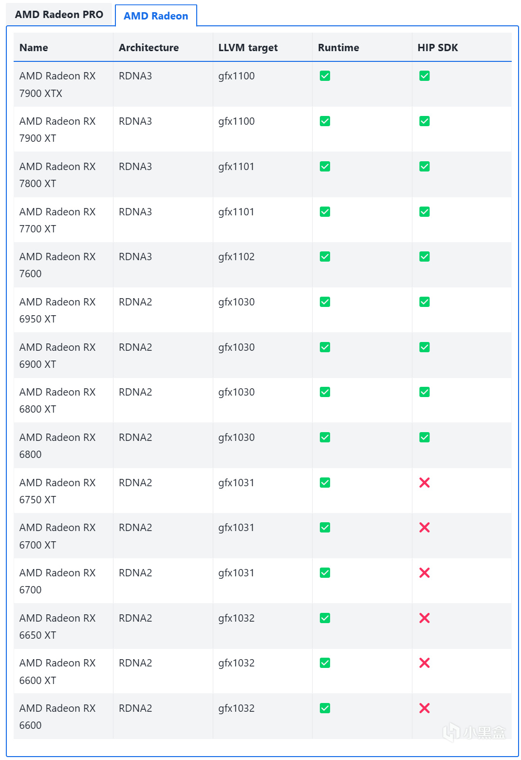 首先爲避免浪費時間,如果你的顯卡不在下面這個列表當中,說明AMD目前還沒有爲你的顯卡做WSL的支持,無法在WSL中運行ROCm。但你依然能用你的顯卡實現我上面說的那些操作,只不過部分應用相對於WSL上的ROCm會損失部分性能,請跳過本文的WSL部分,直接閱讀本文的HIP SDK和Zluda部分。