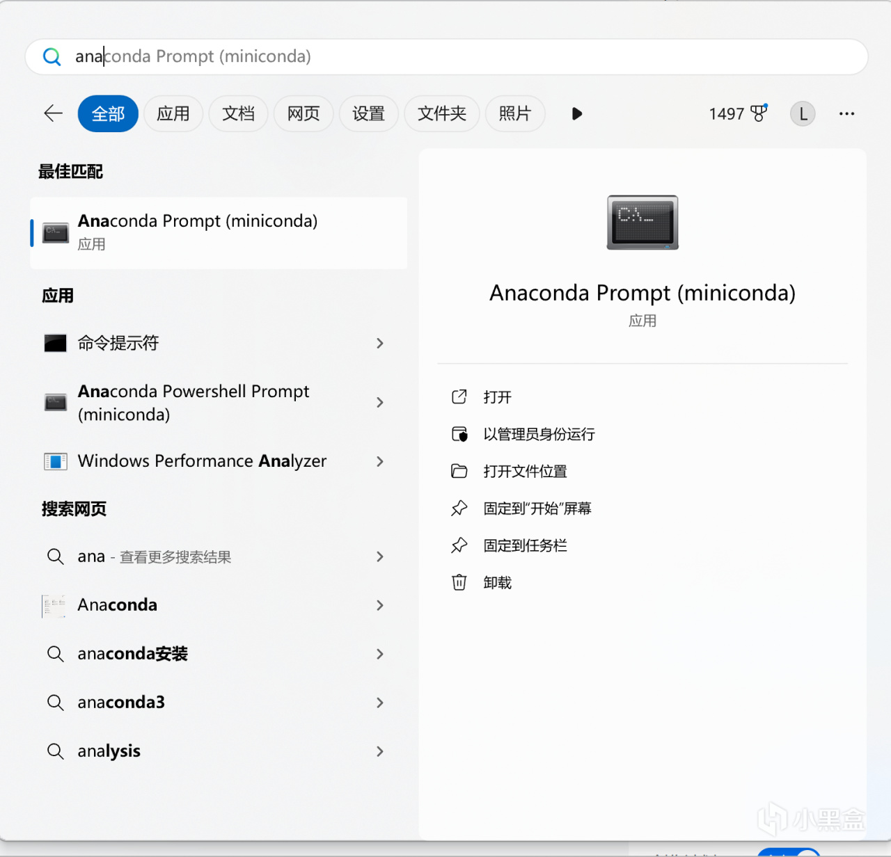 安裝完成後搜索"Anaconda Prompt (miniconda)"並打開。