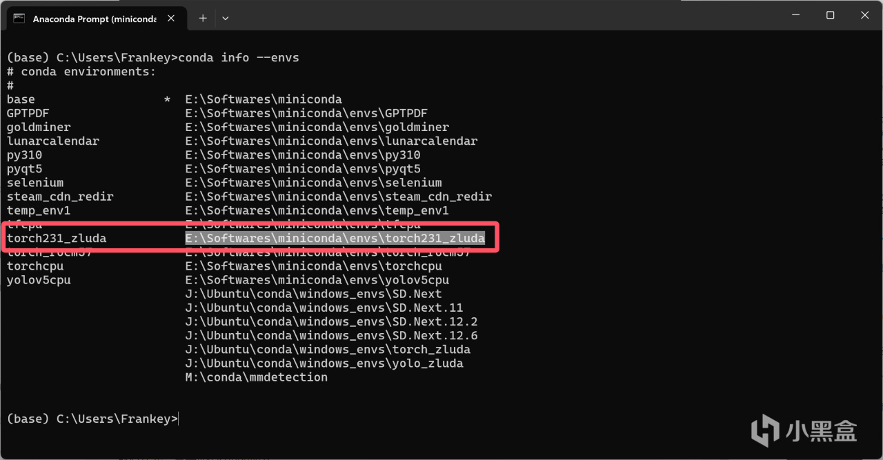 CUDA版本的pytorch安裝完成後,需要對其進行一些修改,首先輸入以下指令列出你所有的環境的位置,並找到你剛剛安裝pytorch的那個環境,將其路徑複製下來: