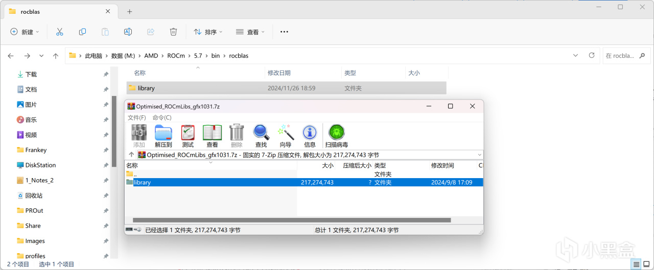 將其中的文件解壓後,複製到%HIP_PATH%\bin\rocblas\中,對於我而言是M:\AMD\ROCm\5.7\bin\rocblas\,若有覆蓋提示直接確認即可。