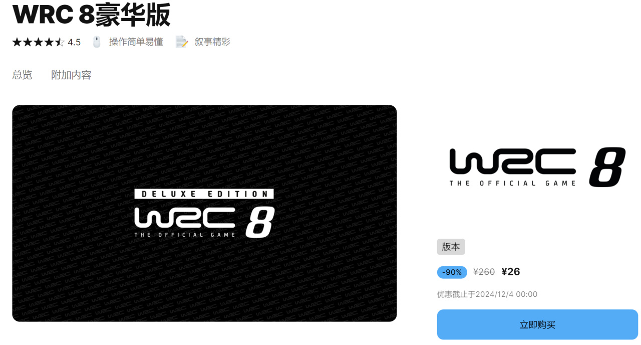 遊戲介紹:購買豪華版,即可獲得完整《WRC 8》遊戲、包含三款標誌性賽車(阿爾派 A110、福特 Escort RS、藍旗亞 Delta HF Integrale)的傳奇賽車包,以及資深車組成員(可在生涯模式中加入團隊)。