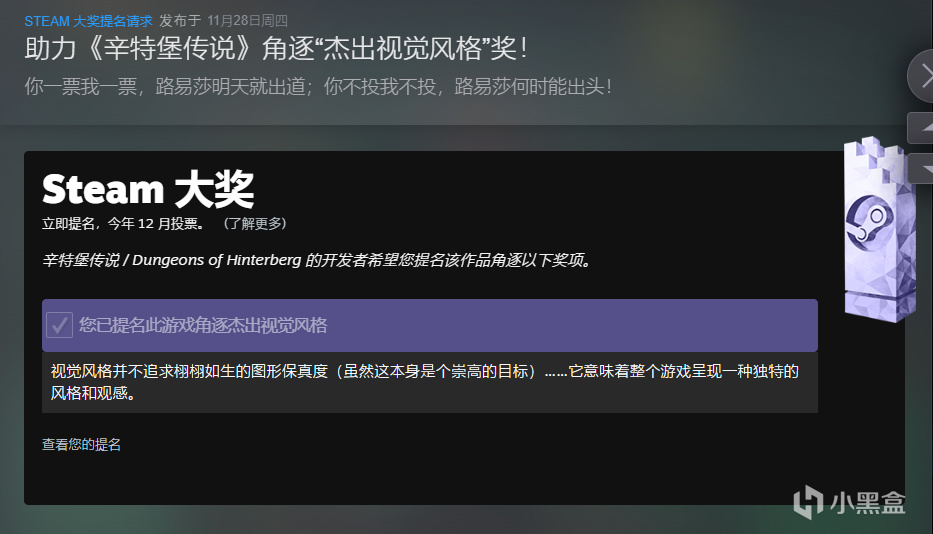 我也希望大家能为《辛特堡传说》拉票支持一下,争取 Steam 大奖“杰出视觉风格”奖项。Steam商店地址点这里~