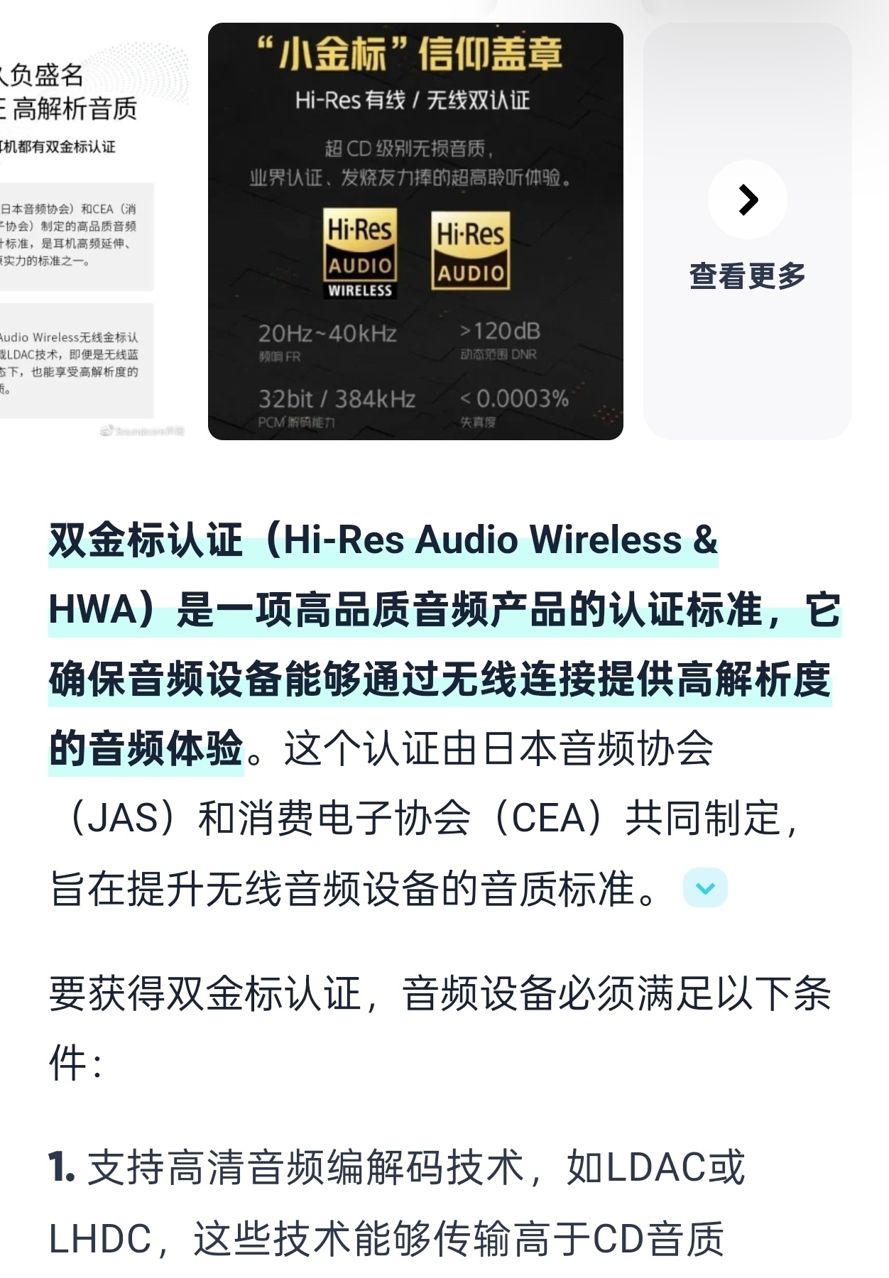 其实很多时候现在的耳机很多功能都是废话(至少对于我们而言)。这个市场鱼龙混杂。竞争压力大,商品想要我们驻足就需要写很多东西。我们要会自动屏蔽一些词汇,除开图上那些,还有些什么千元音质,单耳使用,独家调音,特有技术包括什么abcdefg空间音频这些东西我只能说对我们筛选产品没有用。比如我们需要的是主动降噪ANC,通话降噪ENC。某耳机可能都没有这俩东西,她就说他有巴拉巴拉降噪,这种就要注意了。而且很多耳机功能现在几乎已经是百分百有了,包括单耳使用,兼容设备,什么什么的。均过滤!有头部追踪,有空间音频的产品是会好好介绍的,不会含糊不清的说出来。包括双金标,这东西见仁见智,现在没什么参考价值。不过这个东西一般都指下面这个东西,额而不是什么乱七八糟的。